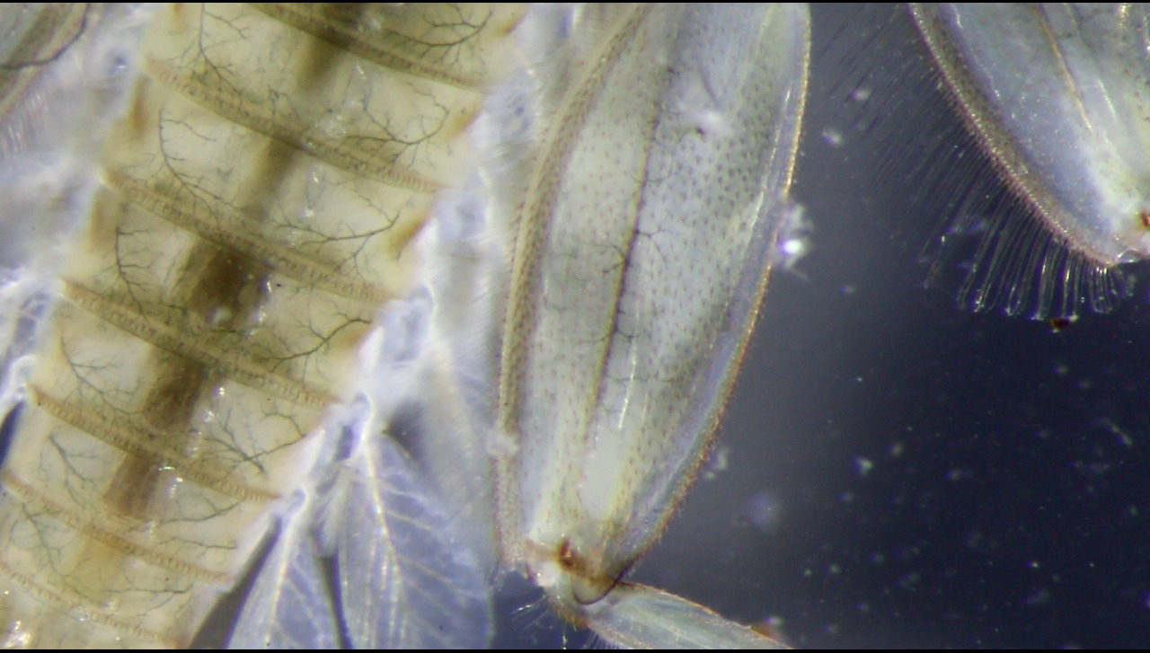 En effet. Par exemple, l’écologue Maria Alp, spécialiste des vies minuscules, est filmée à la même échelle que ses objets d’études. Son discours est observé à partir du détail de ses mains qui manipulent le microscope ou de sa peau. Pour filmer les sédiments, nous nous plaçons à leur échelle en recourant à des images sous-marines, en travaillant sur le flou de l’image, sur l’obstruction de l’objectif par les matières en suspension mais aussi sur la nature sonore des frottements.