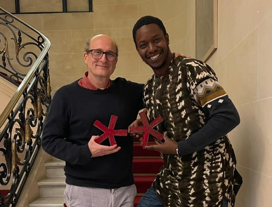Jean-Marie Gigon, réalisateur de « Sculpter la mémoire », revevant une Étoile de la Scam, en décembre 2025 à Paris, ici en compagnie de Thierno Souleymane Diallo, réalisateur du « Cimetière de la pellicule », autre film primé par une Étoile de la Scam.